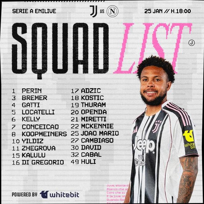 尤文戰(zhàn)那不勒斯大名單:伊爾迪茲領銜,17歲門將胡利入選